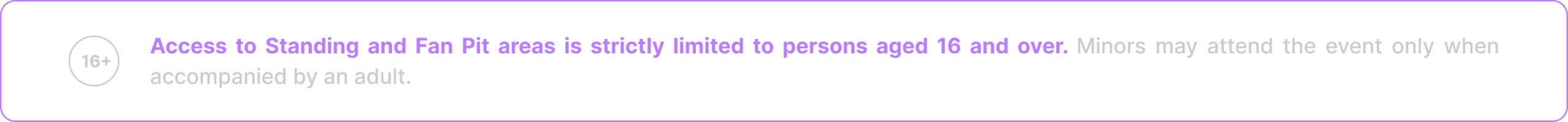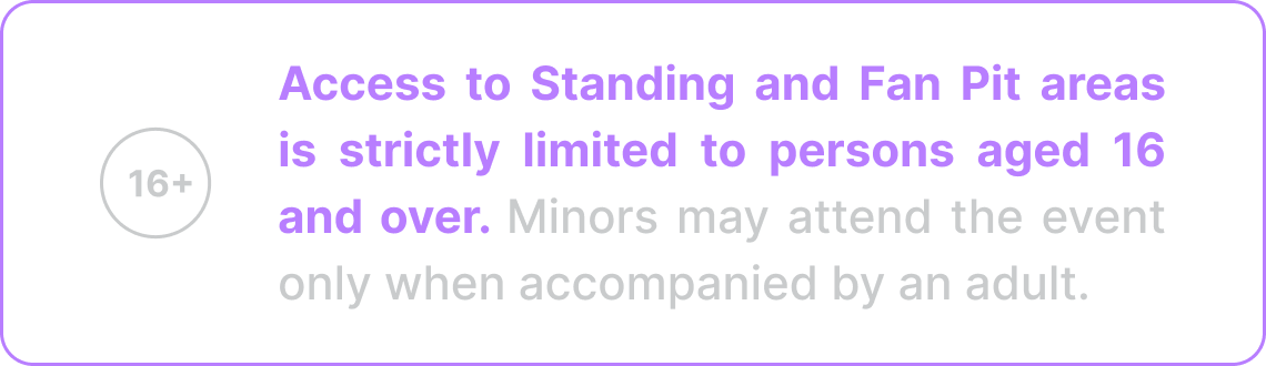 - Access to the Parter and Fan Pit zones is strictly permitted only to persons over 16 years of age. The Organizer reserves the right to deny entry to persons who do not meet the stated age requirement, without entitlement to a refund.