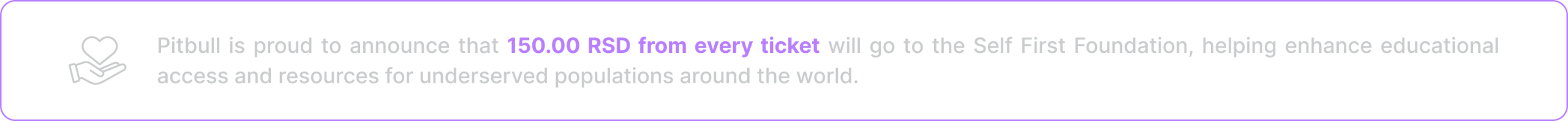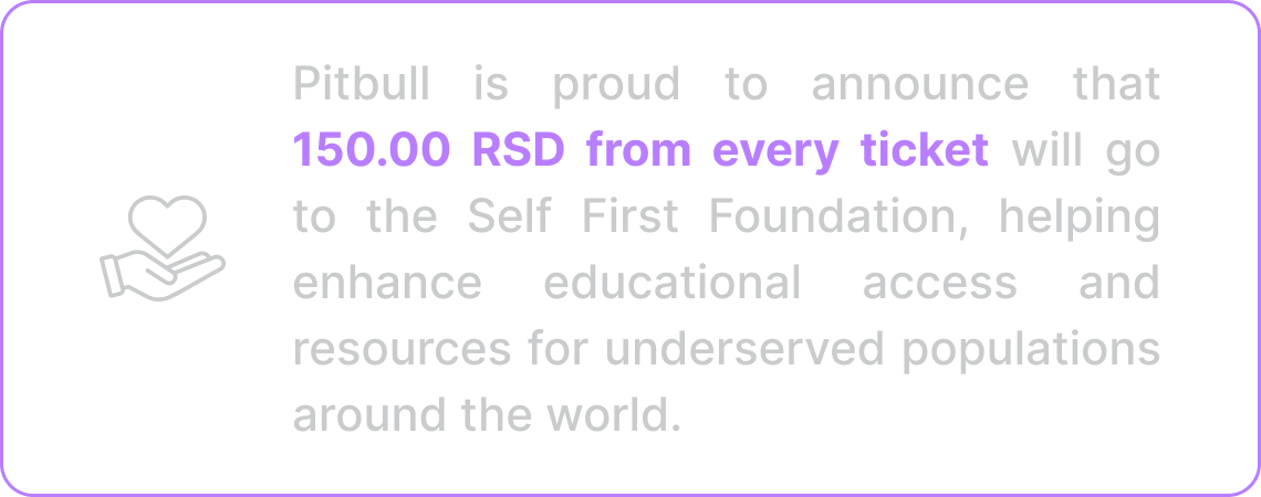 - Pitbull is proud to announce that 150.00 RSD from every ticket will go to the Self First Foundation, helping enhance educational access and resources for underserved populations around the world.