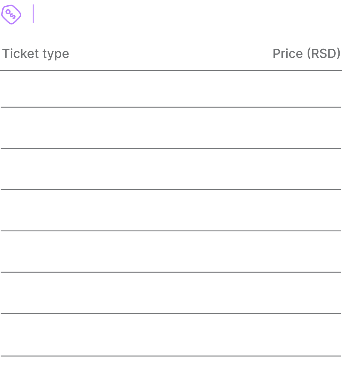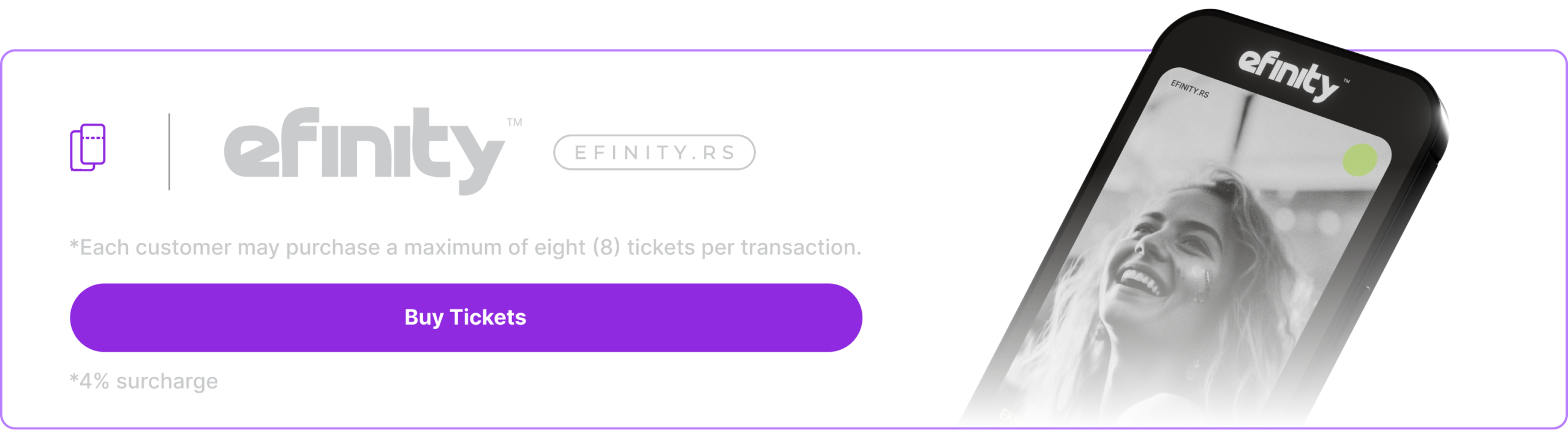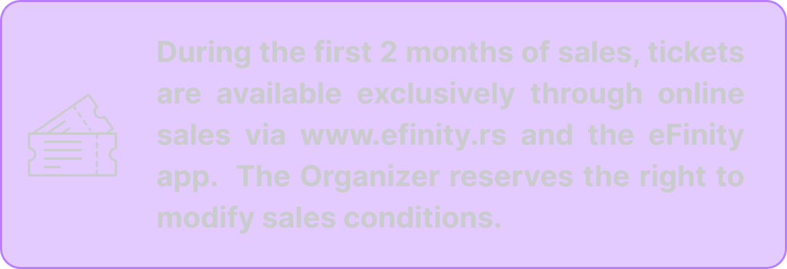 - During the first two (2) months from the commencement of ticket sales, tickets will be available exclusively through online sales, via the official website www.efinity.rs and the eFinity mobile application. The Organizer reserves the right to modify the method and schedule of ticket sales without prior notice.