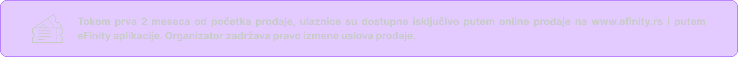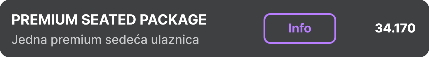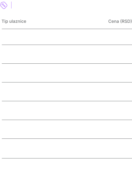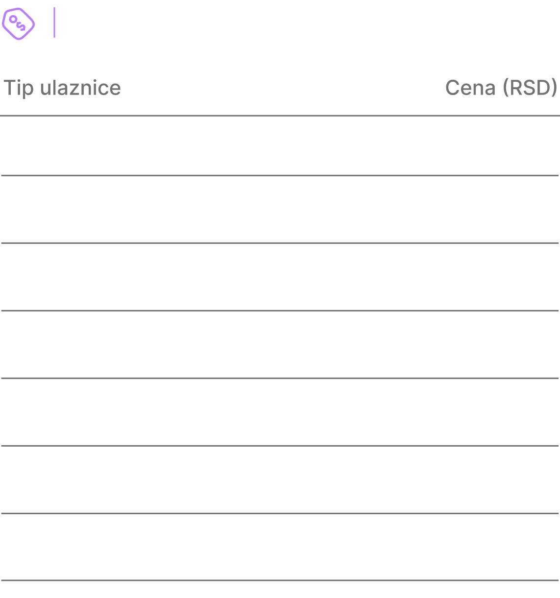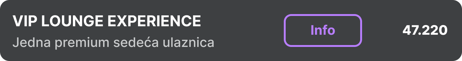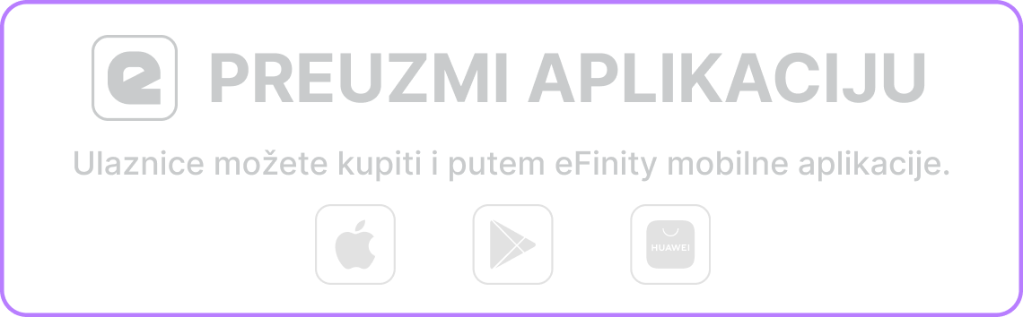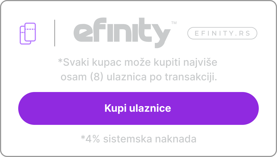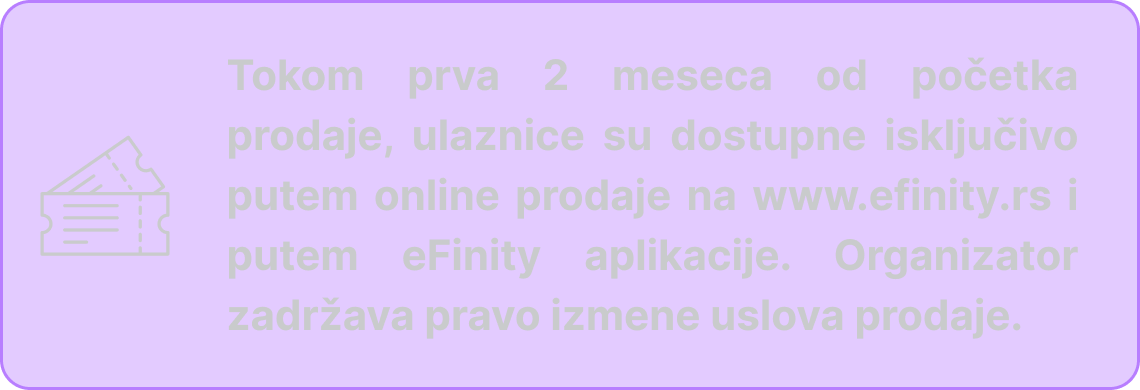 - Tokom prva dva (2) meseca od početka prodaje, ulaznice će biti dostupne isključivo putem online prodaje, i to preko zvanične internet stranice www.efinity.rs i eFinity mobilne aplikacije. Organizator zadržava pravo izmene načina i dinamike prodaje bez prethodne najave.