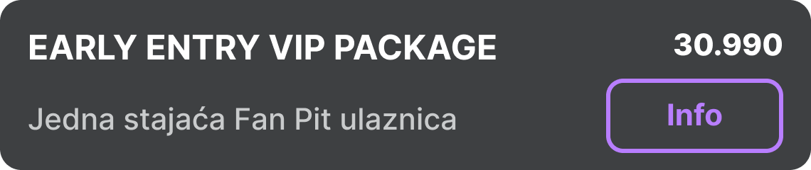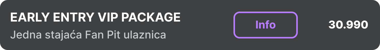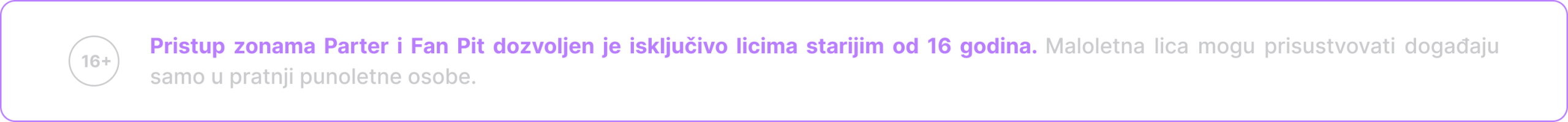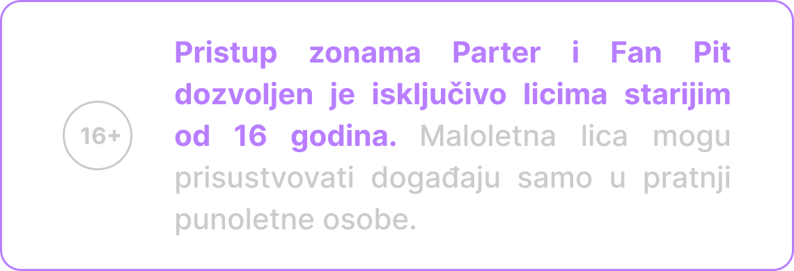 - Pristup zonama Parter i Fan Pit strogo je dozvoljen isključivo licima starijim od 16 godina. Organizator zadržava pravo da uskrati ulaz licima koja ne ispunjavaju navedeni starosni uslov, bez prava na povraćaj sredstava.