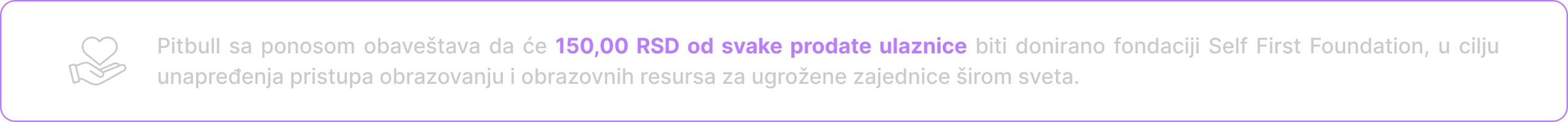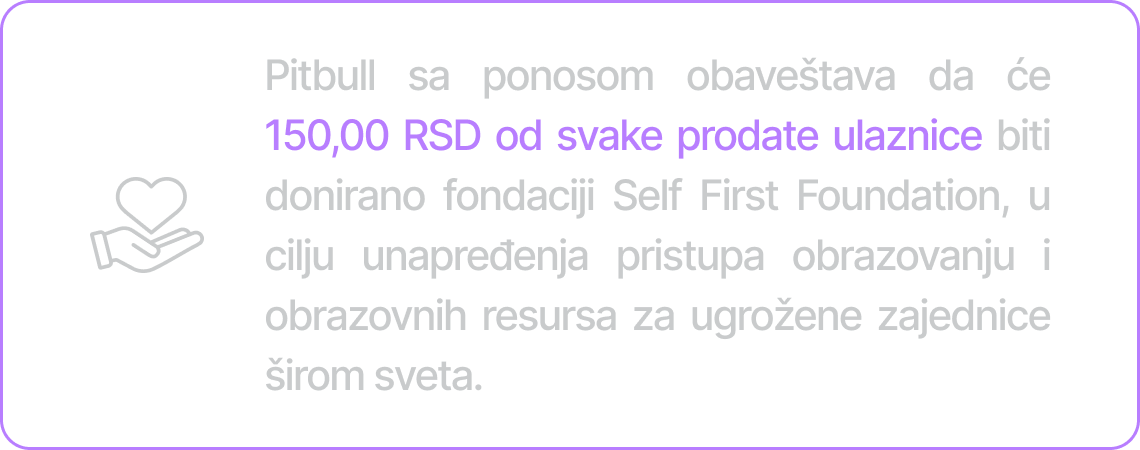 - Pitbull sa ponosom obaveštava da će 150,00 RSD od svake prodate ulaznice biti donirano fondaciji Self First Foundation, u cilju unapređenja pristupa obrazovanju i obrazovnih resursa za ugrožene zajednice širom sveta.